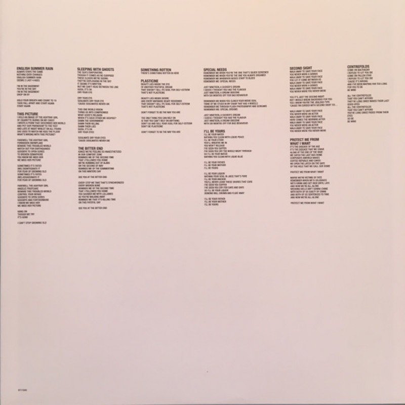 | Track List | A1 Bulletproof Cupid A2 English Summer Rain A3 This Picture A4 Sleeping With Ghosts A5 The Bitter End A6 Something Rotten B7 Plasticine B8 Special Needs B9 I'll Be Yours B10 Second Sight B11 Protect Me From What I Want B12 Centrefolds |