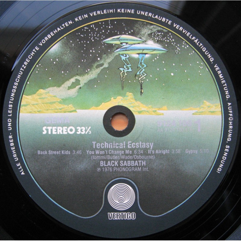 Early copies include a lyric sheet insert.Reissue not before 1977 due to rim text 'Alle Urheber- Und...' which replaced in 1977 'Urheber- Und...' as on [url=https://www.discogs.com/Black-Sabbath-Technical-Ecstasy/release/5036511]original 1976 German LP issue.[/url]